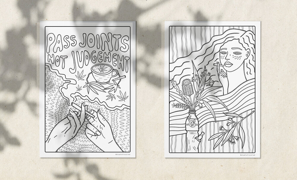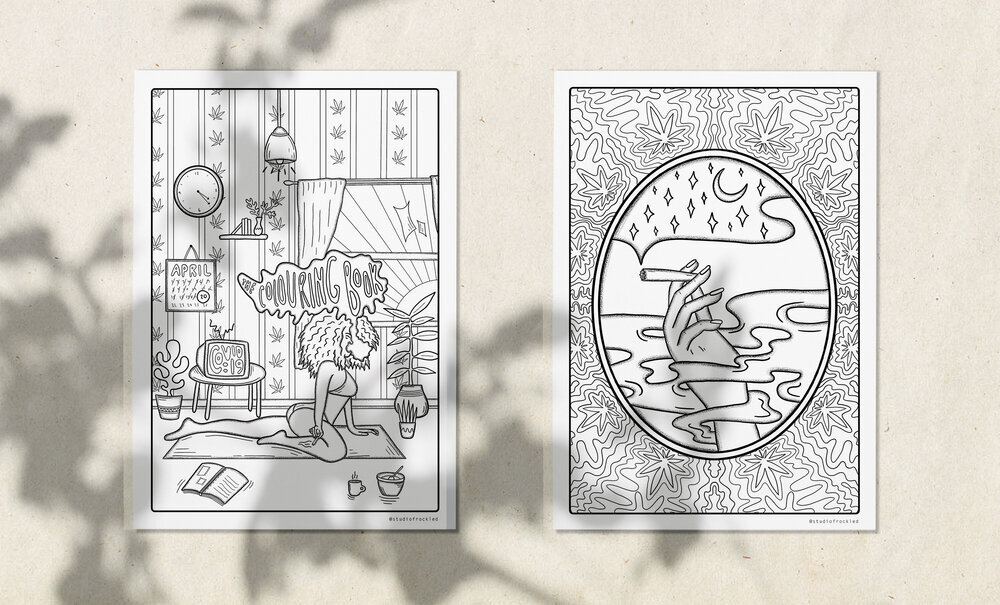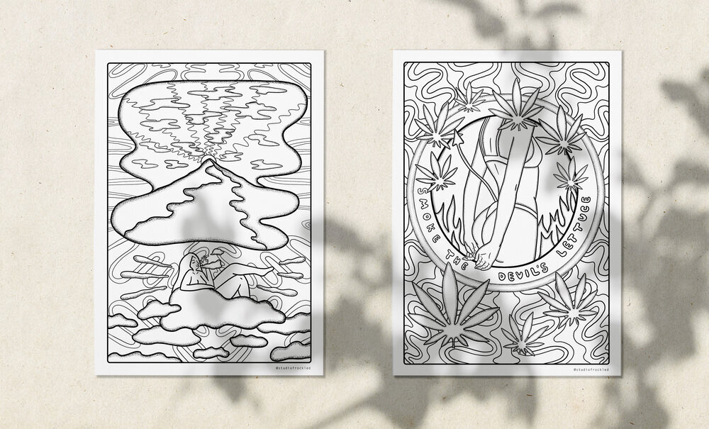 * note : I originally created this at the beginning of 2020 during the pandemic. this collection of prints was inspired by the downloadable 420 colouring book. the goal of the project was to bring people together with the power of creativity and mama ganja, during a time when a pandemic and isolation was ruling daily reality. you can read the original full blog post here